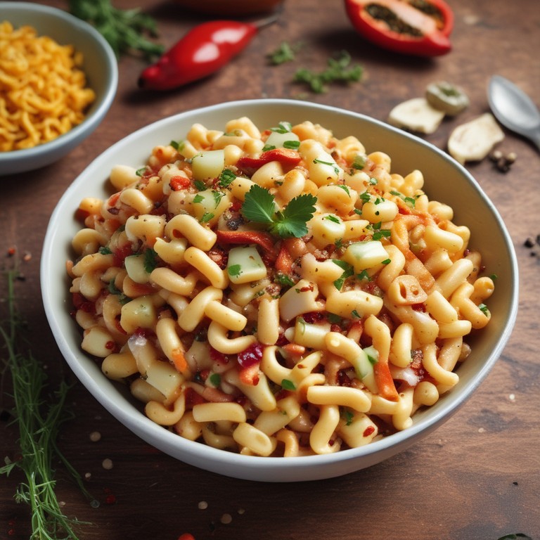 A zesty and flavorful macaroni salad with a spicy kick from red chilli sauce and chilli flakes