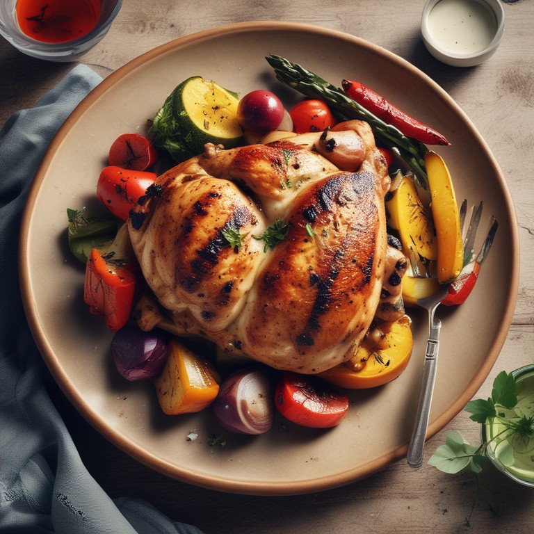 This recipe is perfect for a dieting dinner as it is low in calories and packed with protein and fiber. The grilled chicken is seasoned with aromatic herbs and spices, while the roasted vegetables add a burst of flavor and nutrients. The balsamic vinegar and honey glaze on the vegetables provide a sweet and tangy contrast to the savory chicken. It's a satisfying and nutritious meal that will keep you on track with your diet goals.