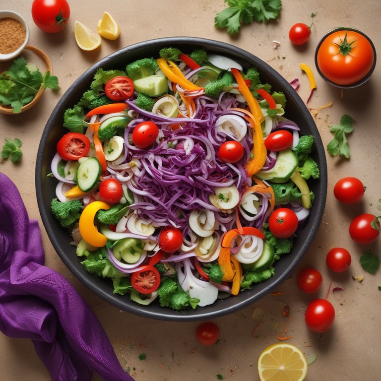 This no-cook vegan rainbow salad is a vibrant and healthy meal that requires no cooking or chopping. It's packed with a variety of colorful vegetables and tossed in a zesty lemon dressing. Perfect for a quick and nutritious meal on busy days!