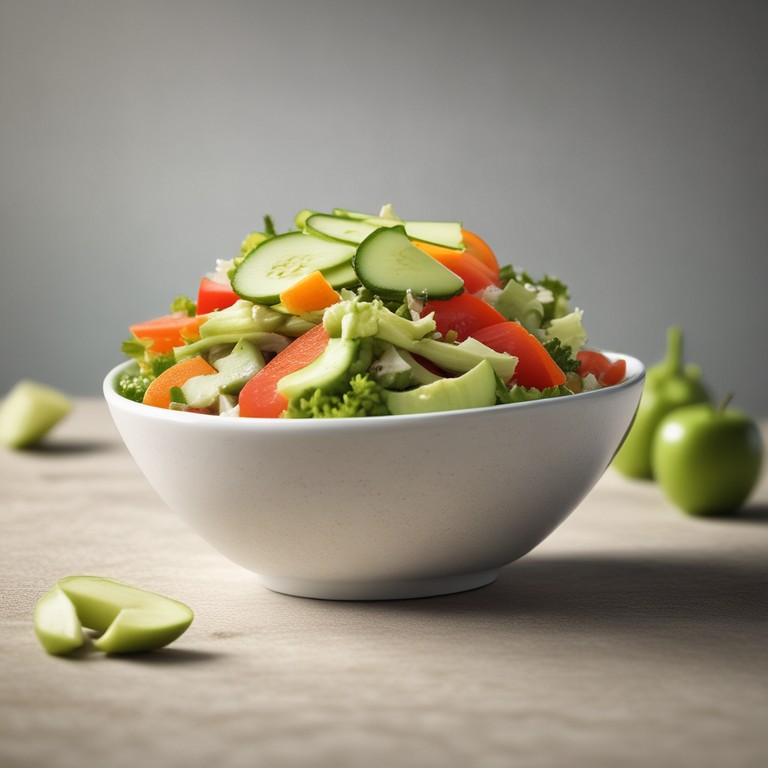 Esta ensalada refrescante combina la frescura del apio, la jugosidad del pepino, la acidez de la manzana verde, la suavidad del tomate y la dulzura de la zanahoria. Es una opción saludable y deliciosa para acompañar tus comidas.