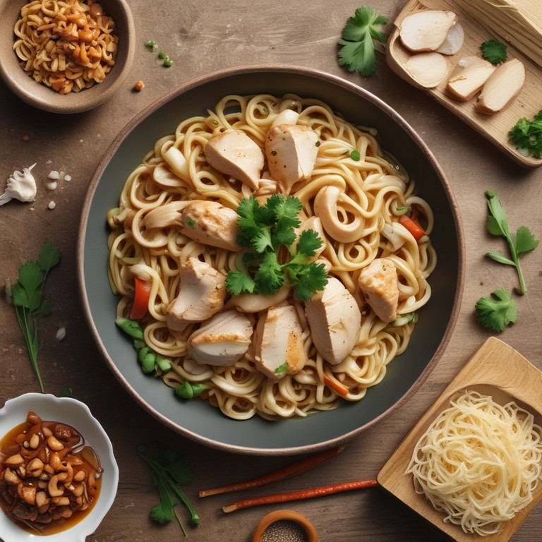 Garlic Chicken Noodles is a flavorful and satisfying dish that combines tender chicken strips, aromatic garlic, and a medley of vegetables with savory noodles. The dish is elevated with a blend of soy sauce, oyster sauce, and sesame oil, creating a delicious umami flavor. Garnished with fresh green onions, cilantro, crunchy peanuts, and bean sprouts, this dish is a perfect balance of textures and flavors. Enjoy this easy-to-make and delicious Garlic Chicken Noodles for a quick and satisfying meal!