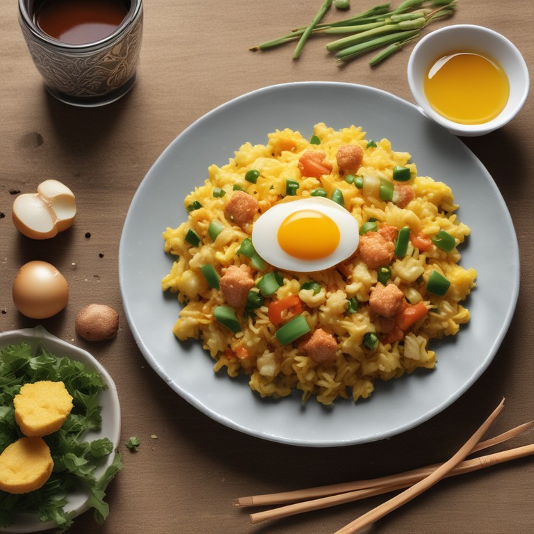 This recipe combines the aromatic flavors of ginger and garlic with fluffy scrambled eggs and fluffy rice, creating a flavorful and satisfying dish. It's a quick and easy meal that can be enjoyed for lunch or dinner.