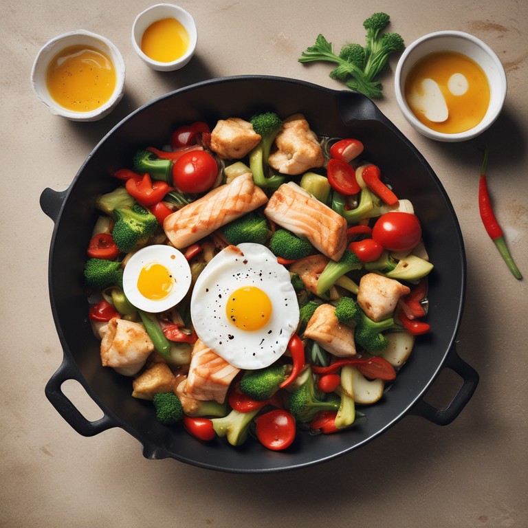 This Fish and Vegetable Stir-Fry with Egg is a delicious and nutritious dish that combines tender fish fillets, colorful mixed vegetables, and fluffy scrambled eggs in a savory soy-based sauce. The addition of ginger and garlic adds a fragrant aroma to the dish, while the red pepper flakes provide a hint of heat. This stir-fry is quick and easy to make, making it a perfect weeknight meal for the whole family.