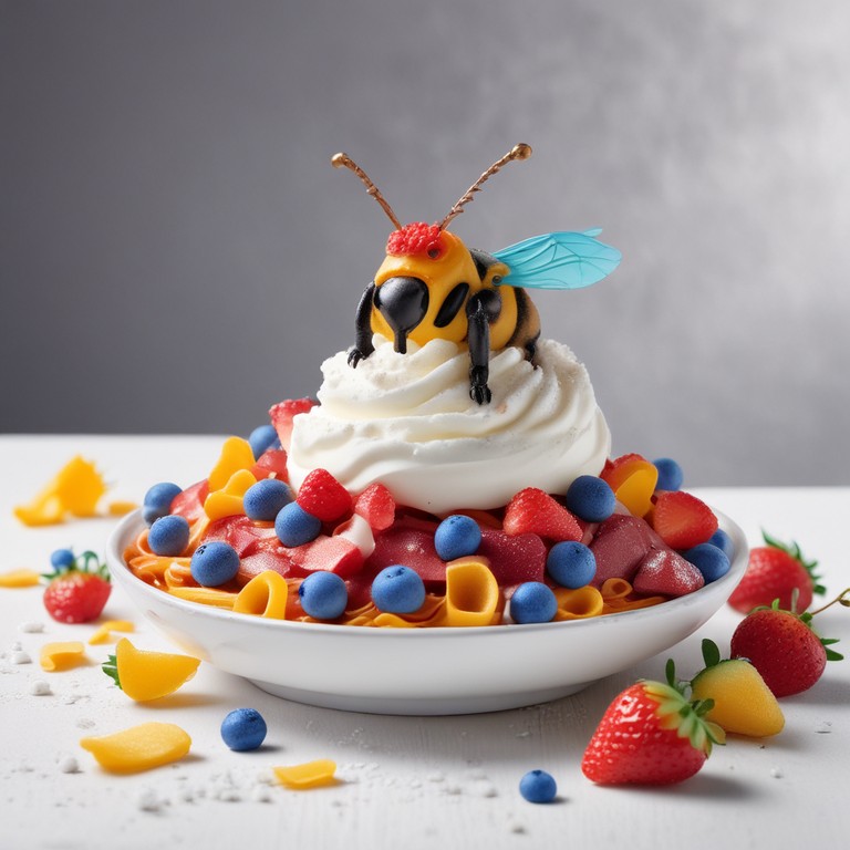 This whimsical recipe combines the fun of bumble bee-shaped pasta with the sweetness of strawberry jam and the crunch of frosted flakes. The addition of blue strawberries adds a unique twist, making it a delightful treat for both kids and adults. Perfect for a playful dessert or a creative breakfast!