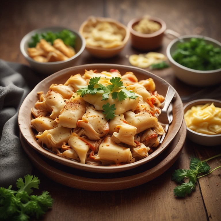 Um prato delicioso de macarrão ninho recheado com frango desfiado e queijo, perfeito para um almoço em família.