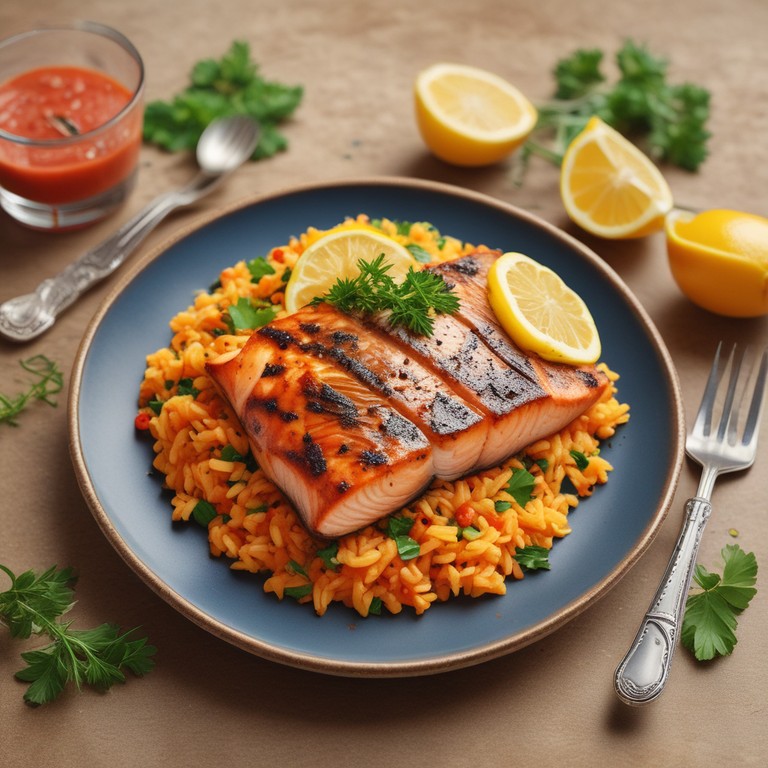 Uma deliciosa receita de salmão grelhado acompanhado de um arroz saboroso com tomate e limão, perfeito para um almoço ou jantar leve e saudável.
