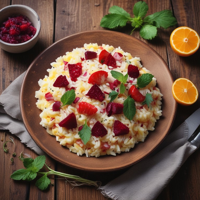 This unique risotto combines the sweetness of banana and strawberries with the earthiness of beetroot and the citrusy brightness of orange, creating a delightful and colorful dish that is both comforting and refreshing.