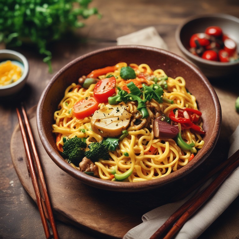 A delicious and spicy noodle dish packed with vegetables and topped with scrambled eggs, perfect for a quick meal.