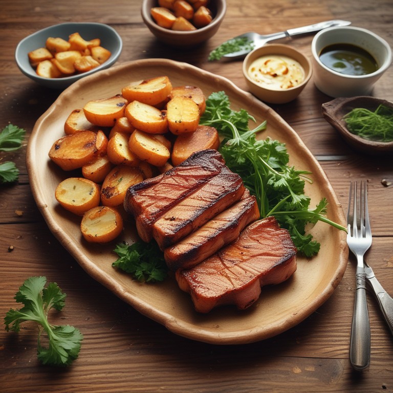 Uma deliciosa combinação de barriga de porco e costoletas grelhadas, acompanhadas de batatas fritas crocantes, perfeita para um churrasco com amigos e família.