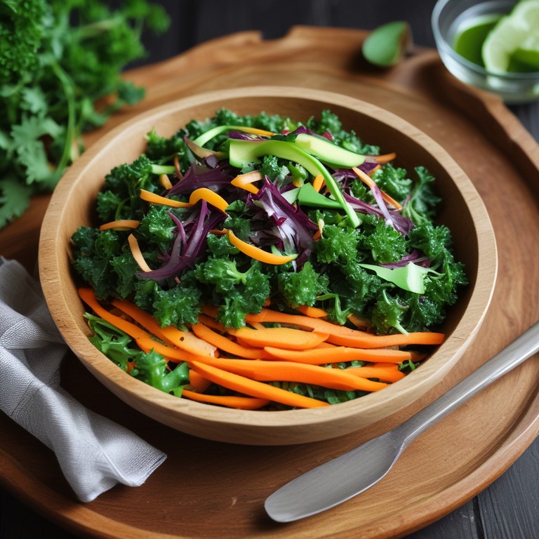 This refreshing salad combines the earthy flavors of kale and carrots with the crispness of snap peas, all brought together by a zesty ginger-lime dressing. Perfect as a side dish or a light meal, it's packed with nutrients and flavor.