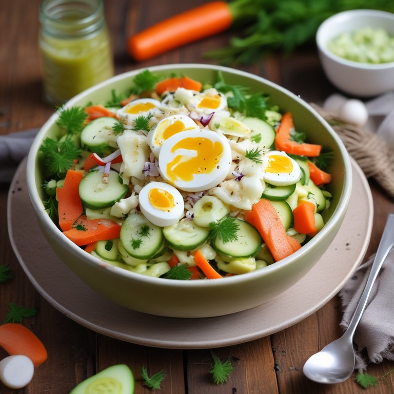 This refreshing cucumber and carrot egg salad is a delightful mix of crunchy vegetables and creamy dressing, perfect for a light lunch or as a side dish. It's easy to prepare and packed with flavor!