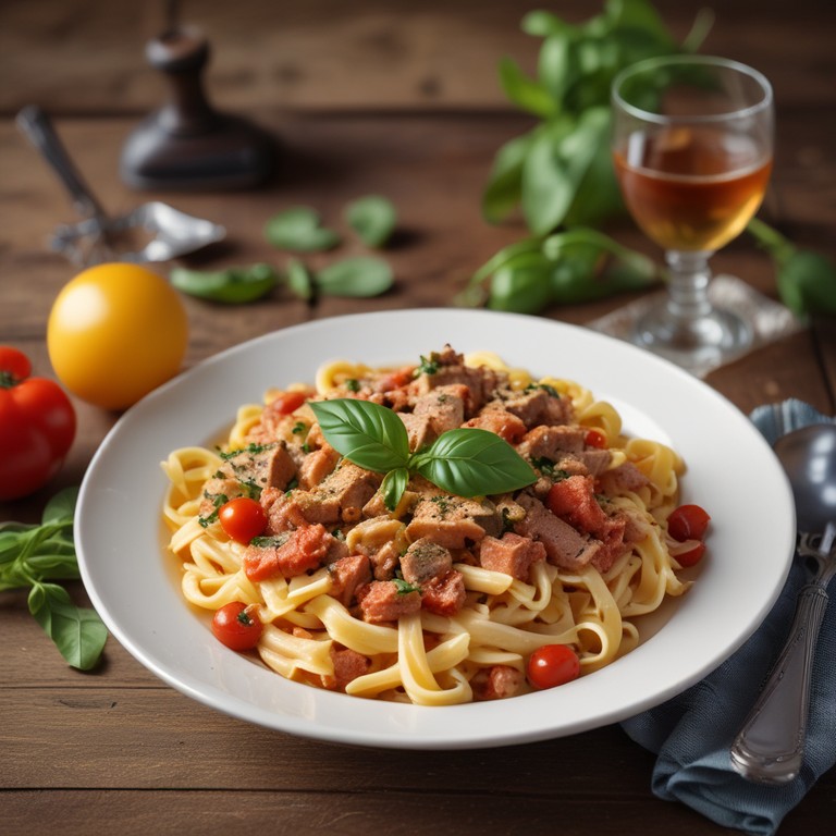 Ein einfaches und schmackhaftes Gericht, das Thunfisch, Nudeln und eine würzige Tomatensauce kombiniert, perfekt für ein schnelles Abendessen.