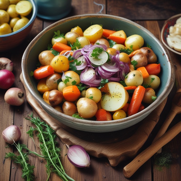A simple yet flavorful dish featuring tender boiled potatoes, sweet carrots, and aromatic onions, perfect as a side for any meal.