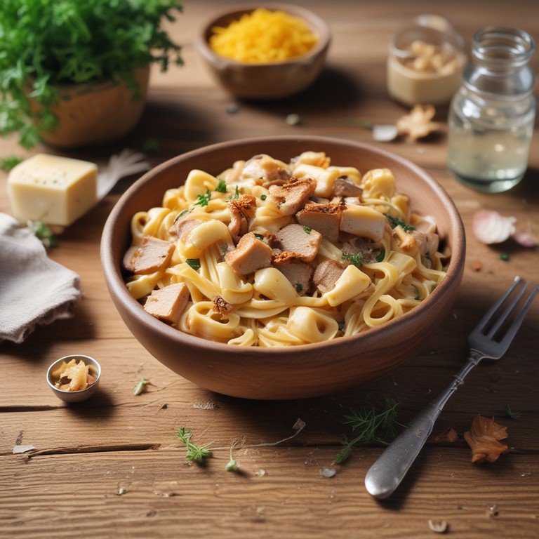 Un plat de pâtes crémeuses savoureux, combinant des cubes de poulet juteux et des oignons caramélisés, parfait pour un dîner réconfortant.
