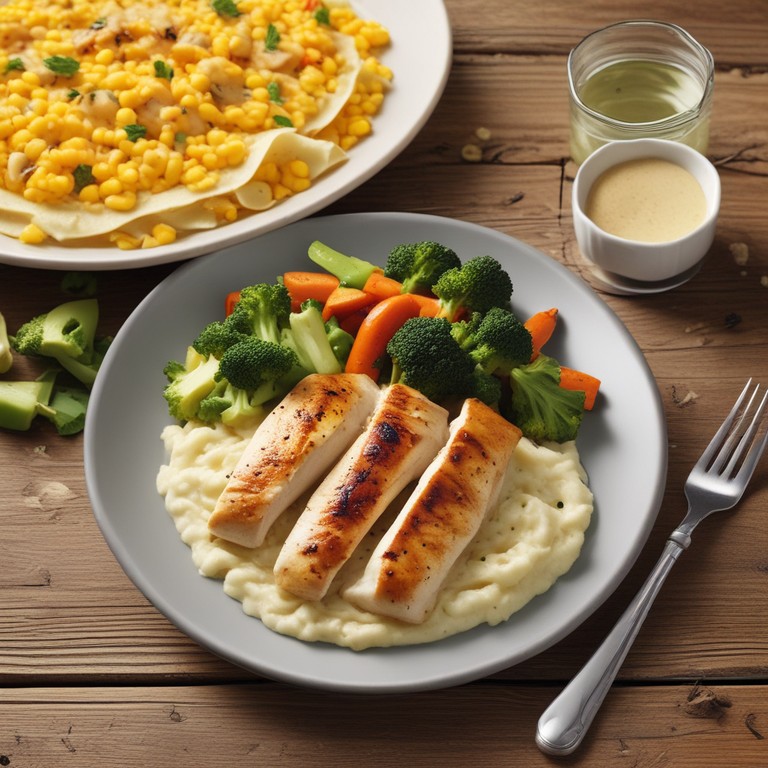 Este plato combina la jugosidad del pollo a la plancha con un suave puré de papa y verduras al vapor, creando una comida equilibrada y deliciosa.