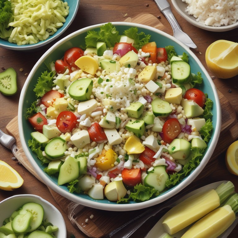 Una ensalada fresca y nutritiva que combina arroz integral con verduras crujientes y quesos cremosos, perfecta para un almuerzo ligero o como acompañamiento.