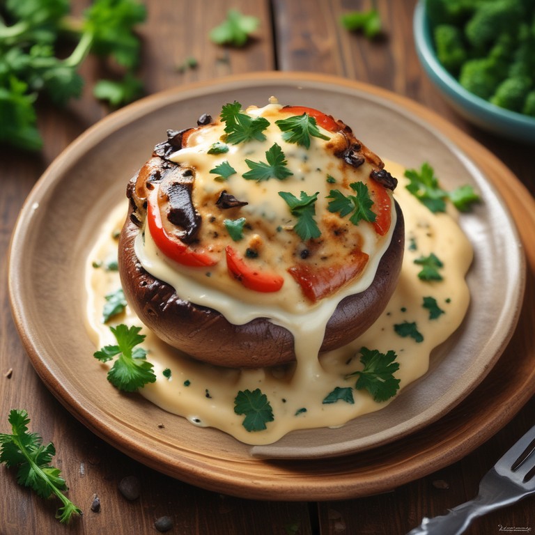 Delicious stuffed mushrooms filled with a creamy cheese mixture, topped with a rich and velvety sauce, perfect as an appetizer or a side dish.