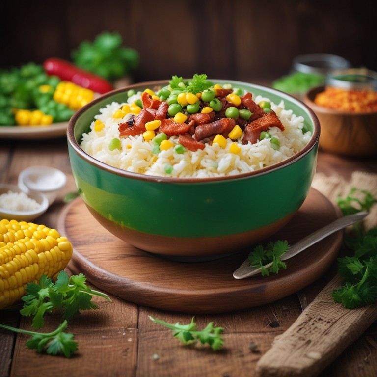 Um prato típico brasileiro que combina arroz, ervilhas, milho, bacon e linguiça calabresa, perfeito para um almoço ou jantar saboroso.
