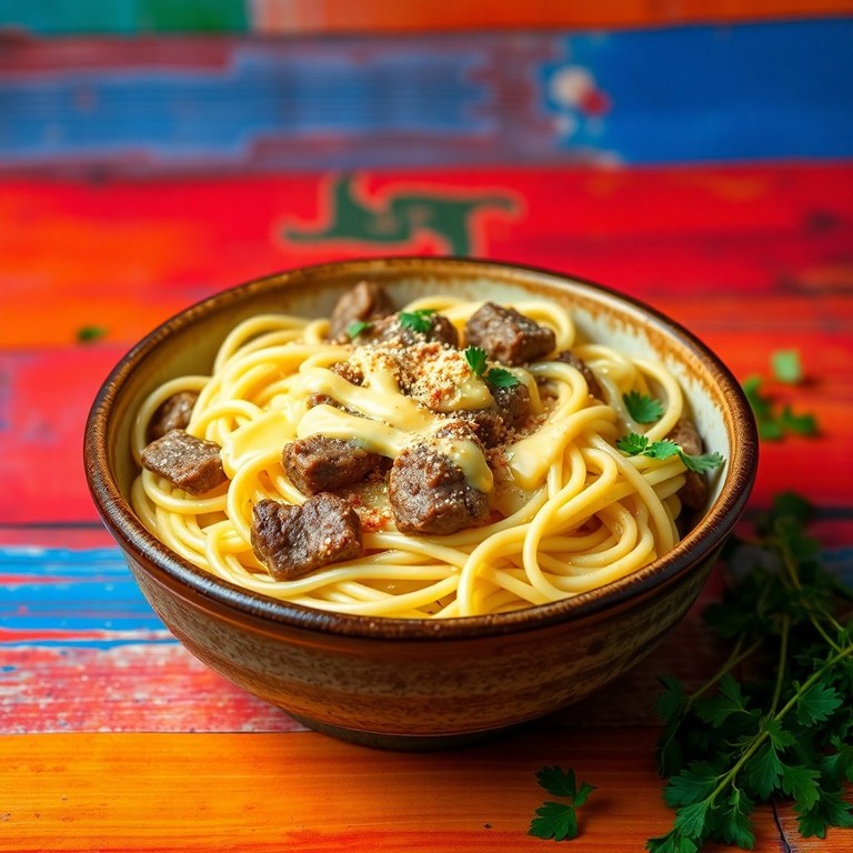 Una combinación única de ingredientes que sorprende al paladar, donde los fideos se mezclan con un bistek jugoso en una salsa cremosa y un toque especial de mayonesa y azúcar.
