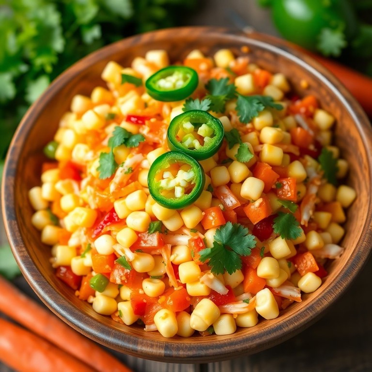 A refreshing and zesty salad that adds a kick to your meal, combining sweet corn and crunchy carrots with a spicy dressing.