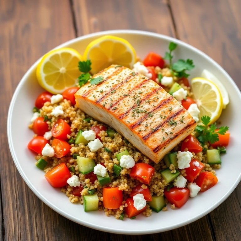 This Lemon Herb Grilled Salmon with Quinoa Salad is a zesty and nutritious dish packed with protein and fresh flavors. The salmon is marinated in a bright lemon herb mixture and grilled to perfection, served alongside a refreshing quinoa salad that complements the fish beautifully.