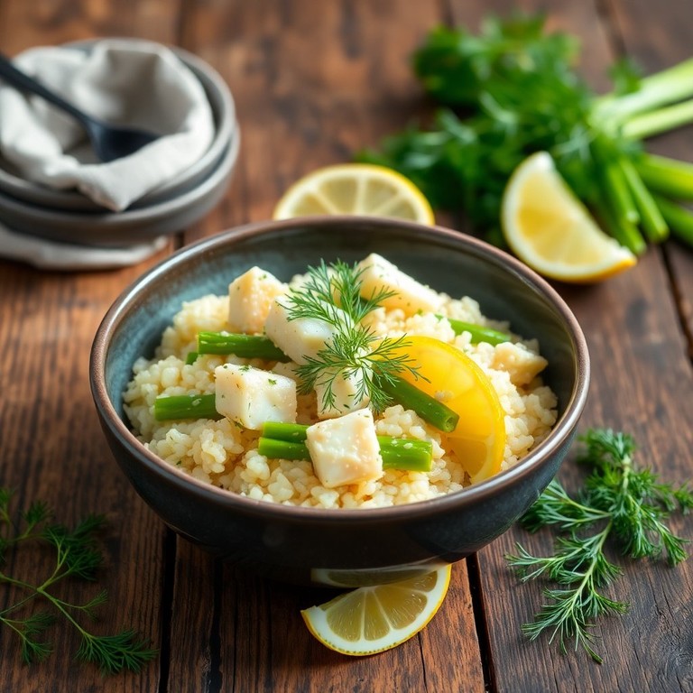 This Lemon-Dill Fish Risotto with Asparagus is a bright and zesty dish that combines creamy Arborio rice with tender fish and crisp asparagus, creating a delightful and refreshing meal perfect for any occasion.