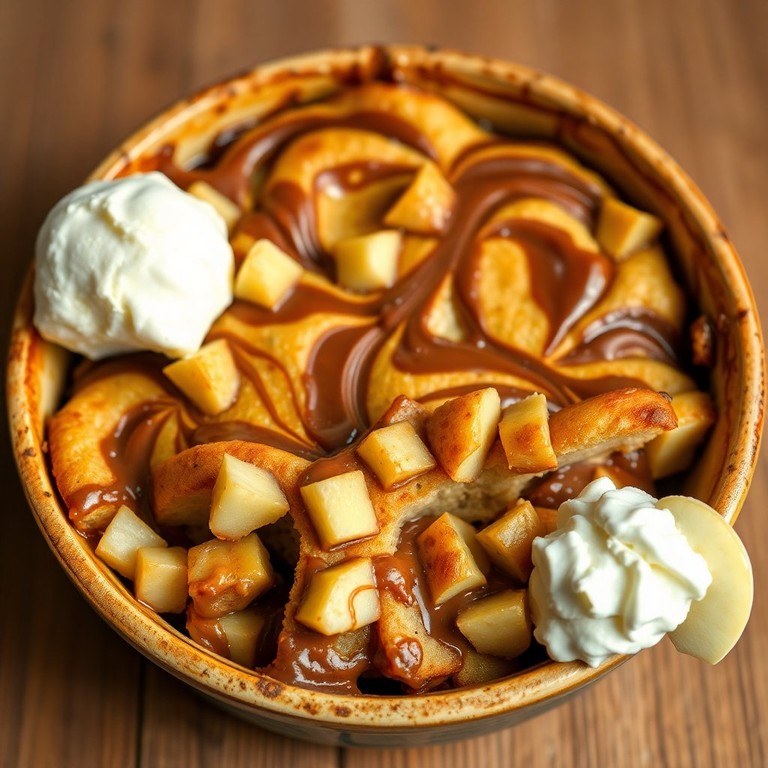 A decadent dessert combining creamy bread pudding with rich Nutella and Biscoff cookie spread, enhanced with diced apples for a delightful twist.