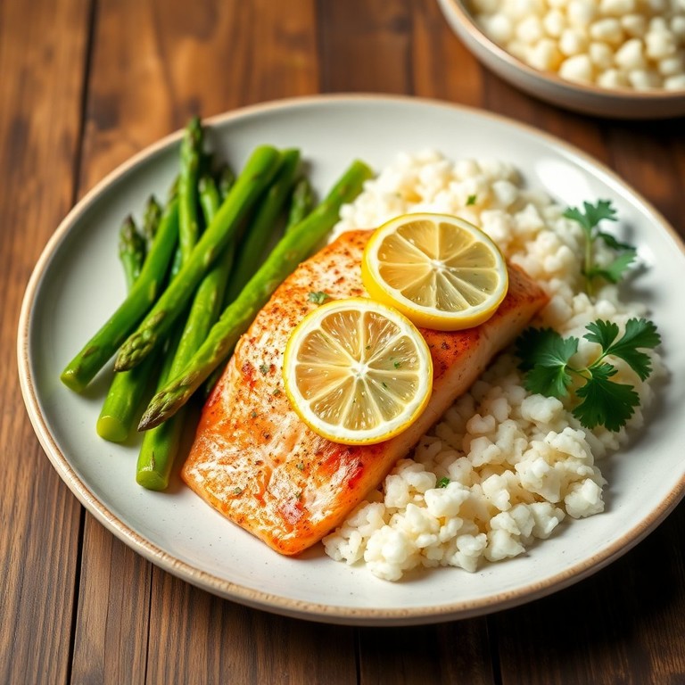 This Baked Salmon with Asparagus and Cauliflower Rice is a deliciously balanced dish that combines omega-3 rich salmon with low-carb vegetables, making it a perfect healthy meal. The flavors of garlic, thyme, and lemon enhance the dish, while the cauliflower rice provides a light and fluffy base.