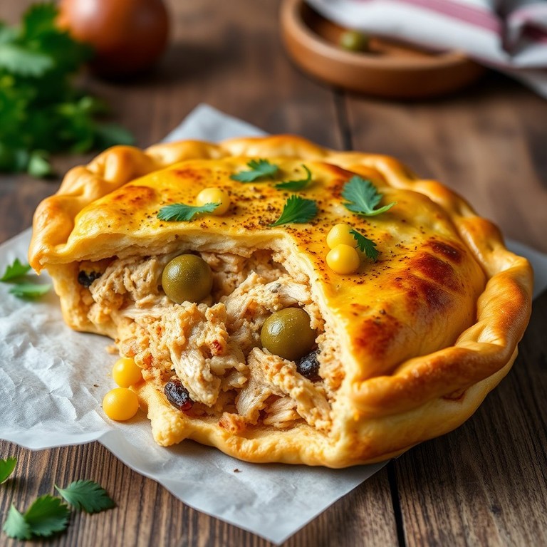 Uma deliciosa torta recheada com frango desfiado e temperos especiais, perfeita para qualquer ocasião.