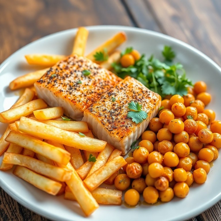 Un plat savoureux de saumon et frites, assaisonné à la perfection, avec des pois chiches épicés pour une touche de croquant.