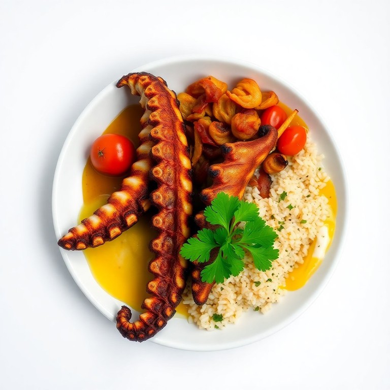 Polvo Grelhado na Manteiga de Gengibre com Arroz Caldoso e Farofa de Beiju com Bacon em Gramas