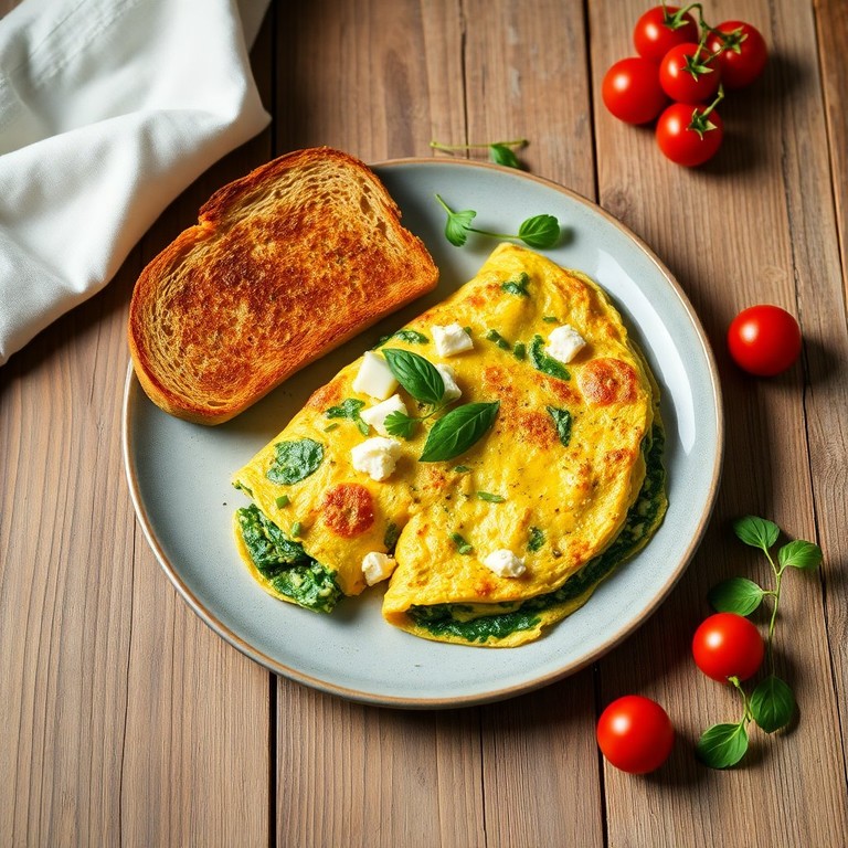 This Spinach and Feta Omelette is a protein-packed breakfast option that combines the freshness of spinach with the tangy flavor of feta cheese, served alongside hearty whole grain toast for a nutritious start to your day.