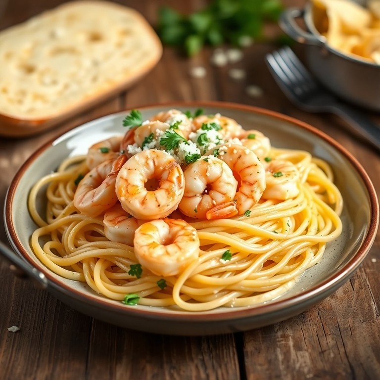 Un plat savoureux de scampis enrobés d'une sauce crémeuse à l'ail, servi avec des pâtes délicates. Parfait pour un dîner élégant ou un repas réconfortant.