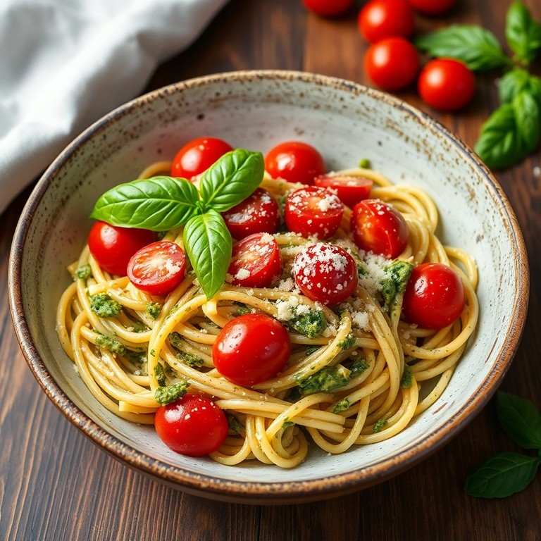 Deze romige pesto pasta met kersen tomaten is een heerlijke combinatie van smaken die perfect is voor een snelle en smakelijke maaltijd. De romige saus, gemaakt van verse basilicum pesto en room, omhult de al dente pasta en wordt vergezeld door sappige kersen tomaten. Een ideale keuze voor een doordeweekse avond of een speciale gelegenheid.