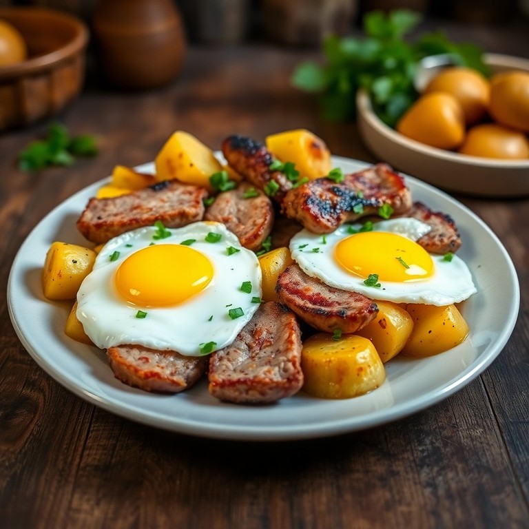 Uma deliciosa mistura de carne suína, batatas e ovos, perfeita para qualquer refeição.