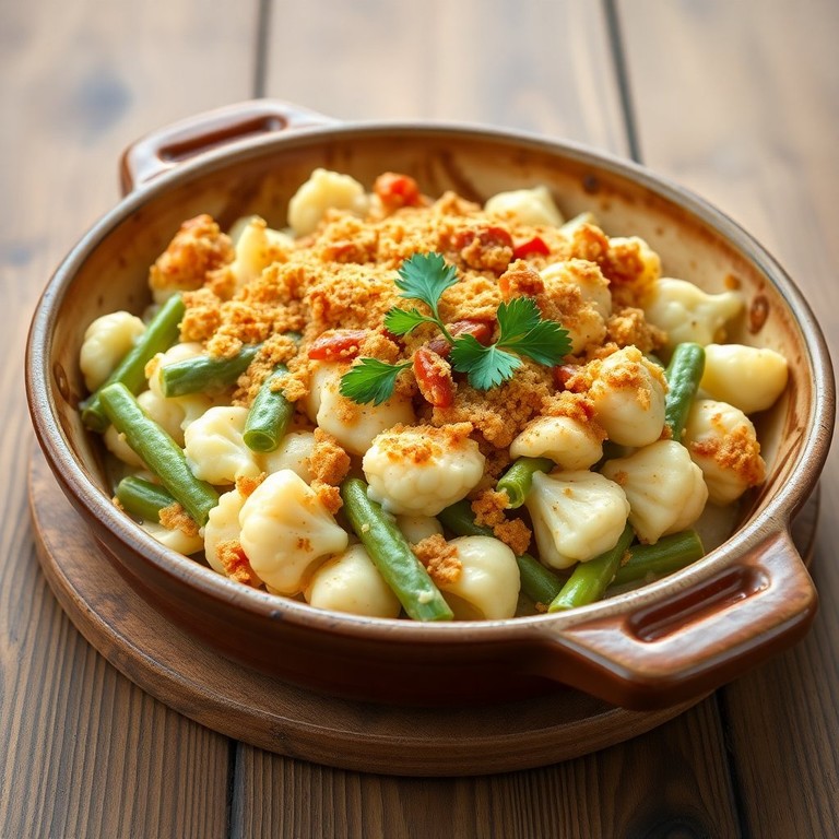 This creamy cauliflower and green bean casserole is a comforting dish perfect for family gatherings. Topped with a crunchy layer of breadcrumbs and red bell pepper, it combines rich flavors and textures that everyone will love.