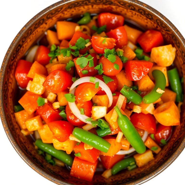A quick and zesty stir-fry bursting with fresh flavors, perfect for a weeknight dinner or a light lunch. This dish combines the sweetness of tomatoes, the crunch of onions, and the heat of chilies, all brought together with a savory sauce.