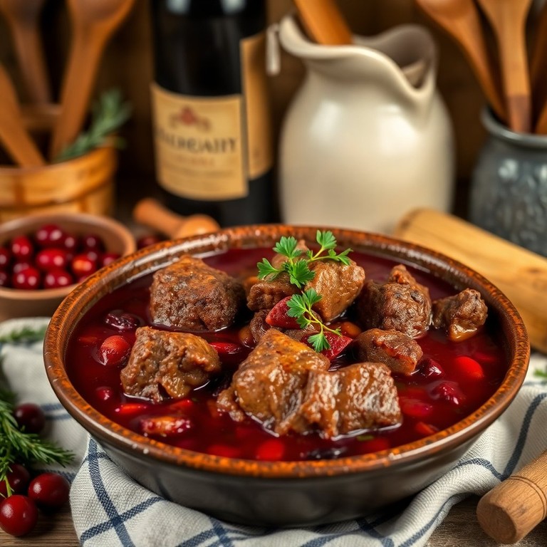 Ein herzhaftes Wildgericht, das mit einer aromatischen Rotweinsauce und fruchtigen Preiselbeeren verfeinert wird.