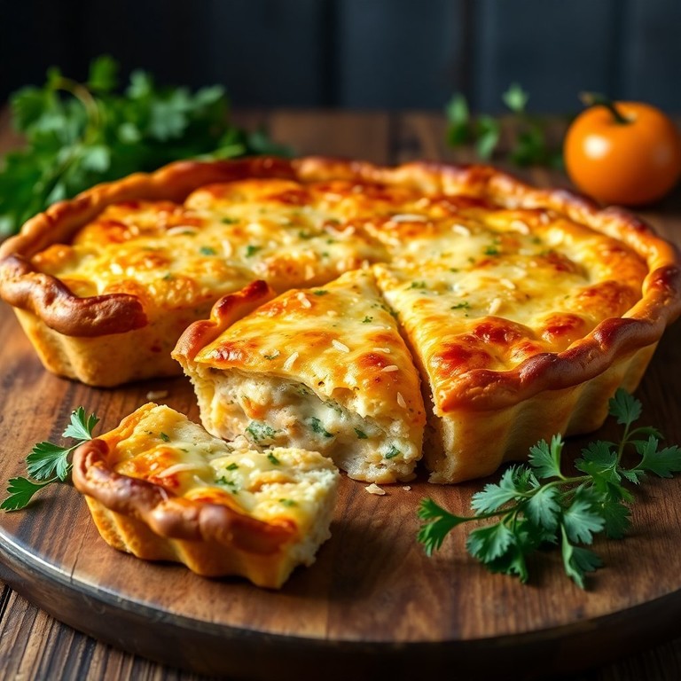 Uma deliciosa torta recheada com frango desfiado e coberta com queijo parmesão gratinado, perfeita para um almoço em família ou um lanche especial.