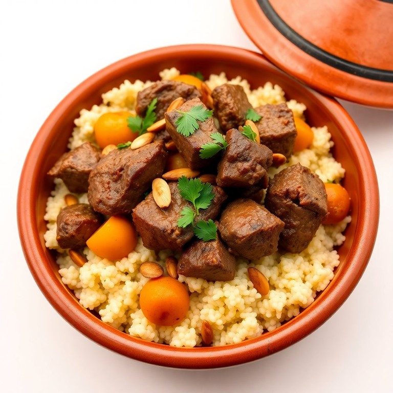 A rich and aromatic Moroccan stew featuring tender lamb, sweet apricots, and crunchy almonds, served over fluffy couscous.