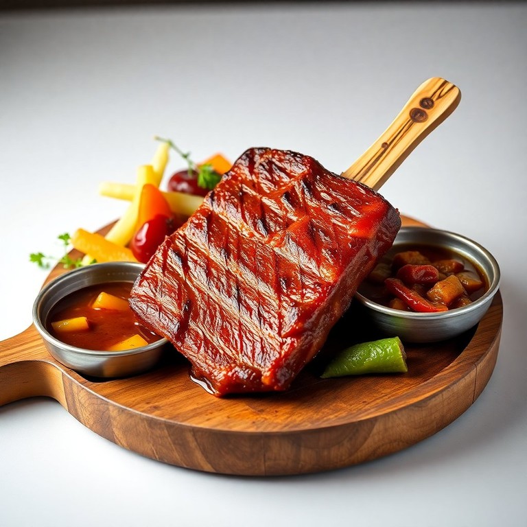 Uma deliciosa paleta bovina assada, coberta com um molho barbecue adocicado e picante, perfeita para um churrasco com amigos e família.