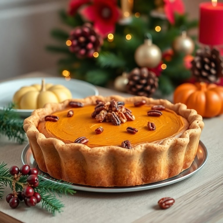A classic pumpkin pie with a holiday twist, featuring a rich filling enhanced with spices and topped with crunchy pecans and sweet cranberries, perfect for your Christmas table.