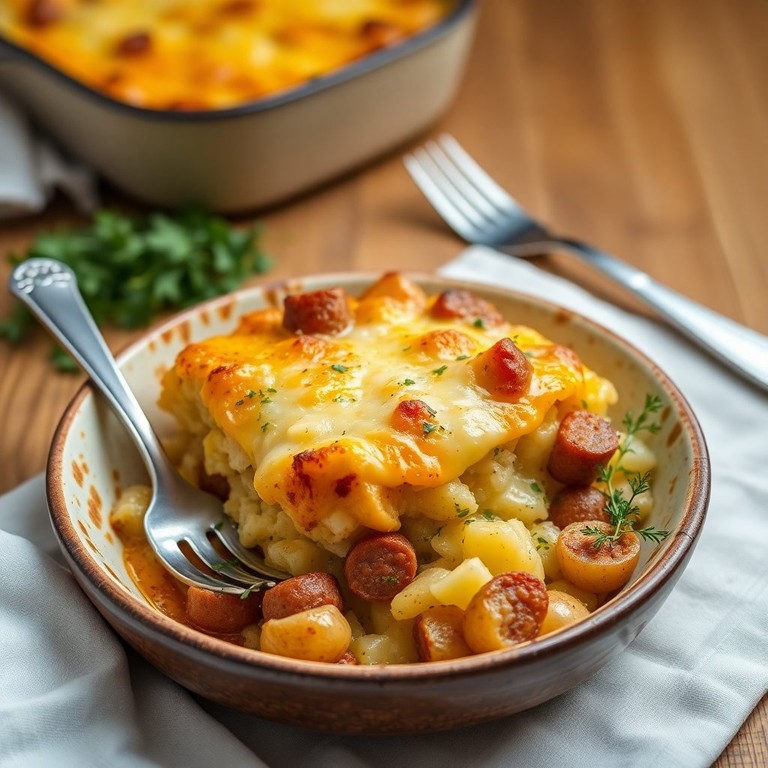 Сытное блюдо, объединяющее в себе колбасу, картошку и сырную корочку.