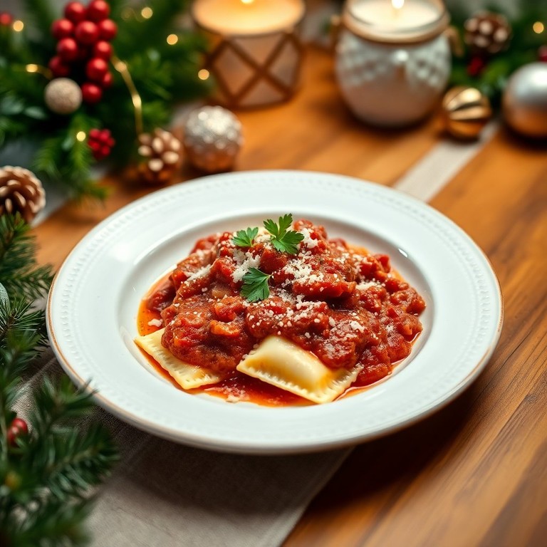 Des raviolis délicats et faits maison, garnis d'une sauce bolognaise savoureuse, parfaits pour un repas de fête qui impressionnera vos invités.