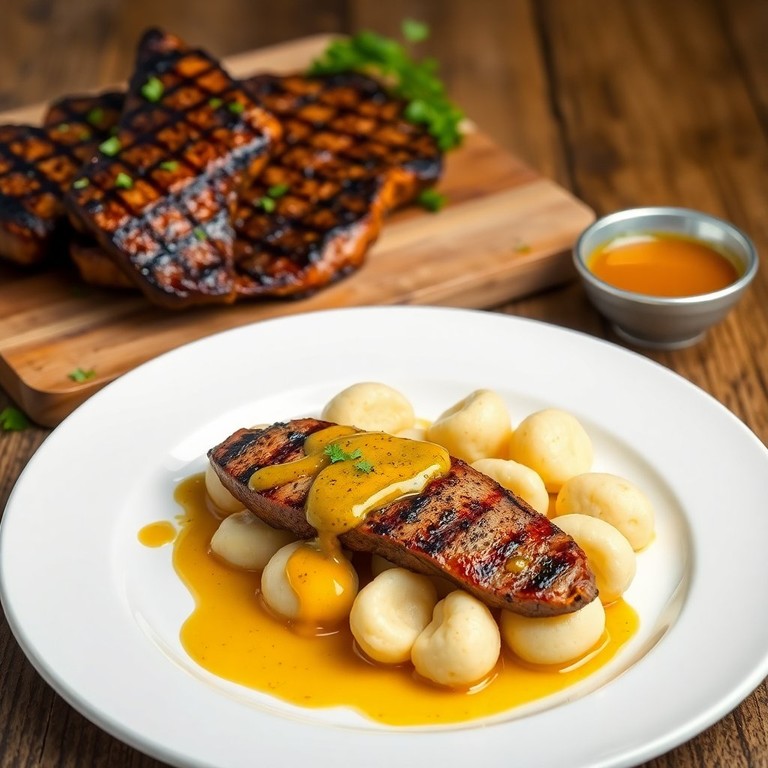 Una deliciosa combinación de filetes a la parrilla acompañados de una salsa dulce y picante de mostaza y miel, perfectos para disfrutar con gnocchis.