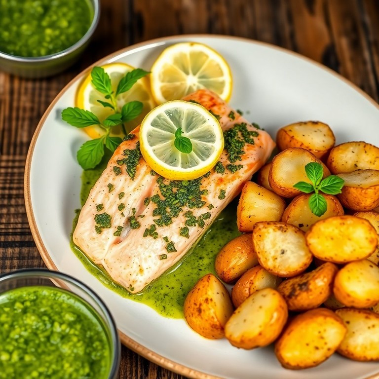 Ein saftiger Lachs, perfekt mariniert mit frischem Pesto und serviert mit knusprig gerösteten Kartoffeln.
