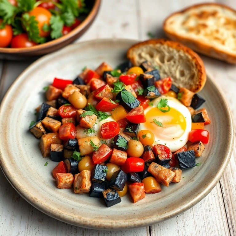 Un delicioso plato de desayuno que combina la suavidad del huevo con la textura de la berenjena y el sabor salado de la mortadela.