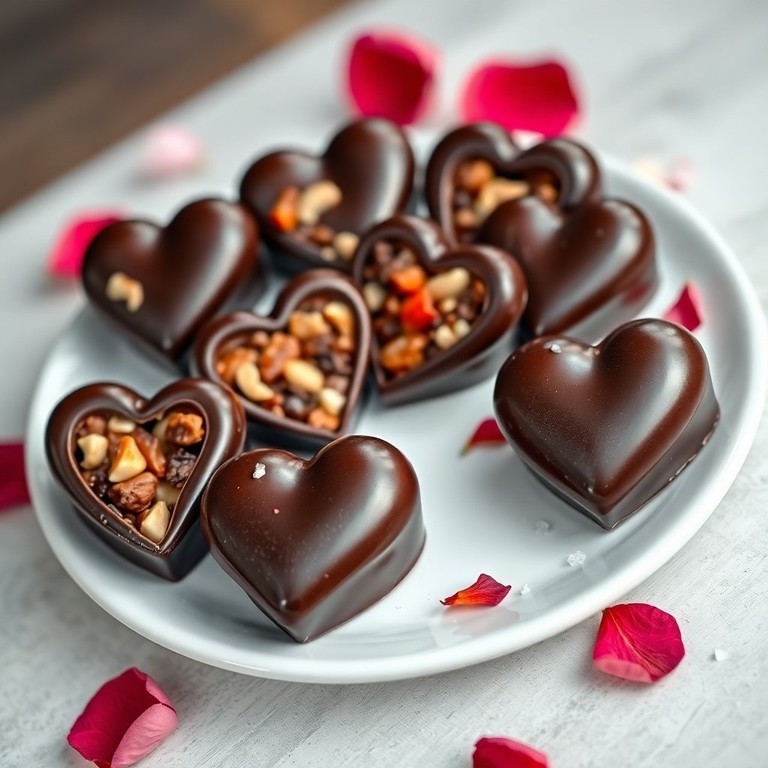 Indulge in these easy-to-make heart-shaped chocolate bites, perfect for a sweet snack. Made with melted dark chocolate and filled with your choice of nuts or dried fruits, these delectable treats require just 30 minutes and are a festive treat for any romantic occasion.