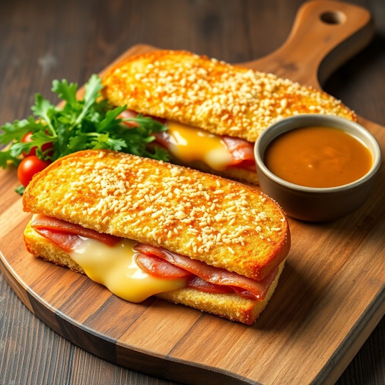 Delectable grilled sandwiches layered with ham, melted cheeses, and a crispy Parmesan crust; perfect for a quick and satisfying lunch.
