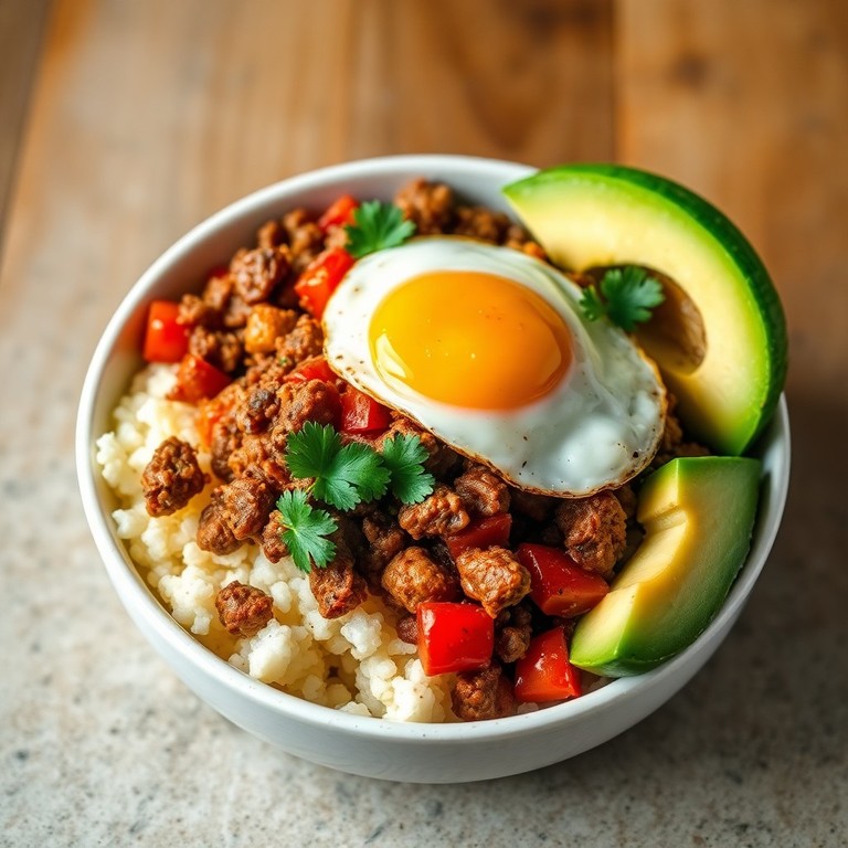 Un nutritivo bowl de carne molida sazonada con especias mexicanas, servido sobre una cama de arroz de coliflor y cubierto con un huevo frito. Ideal para una comida rápida y saludable en menos de 25 minutos.
